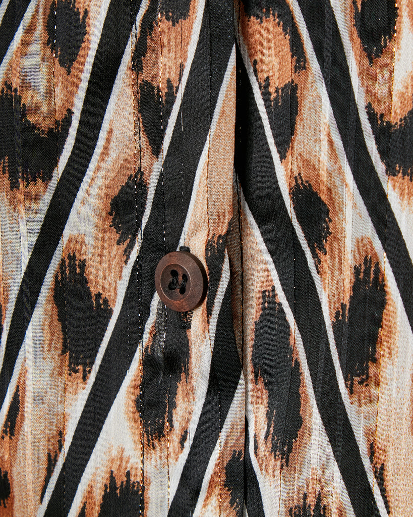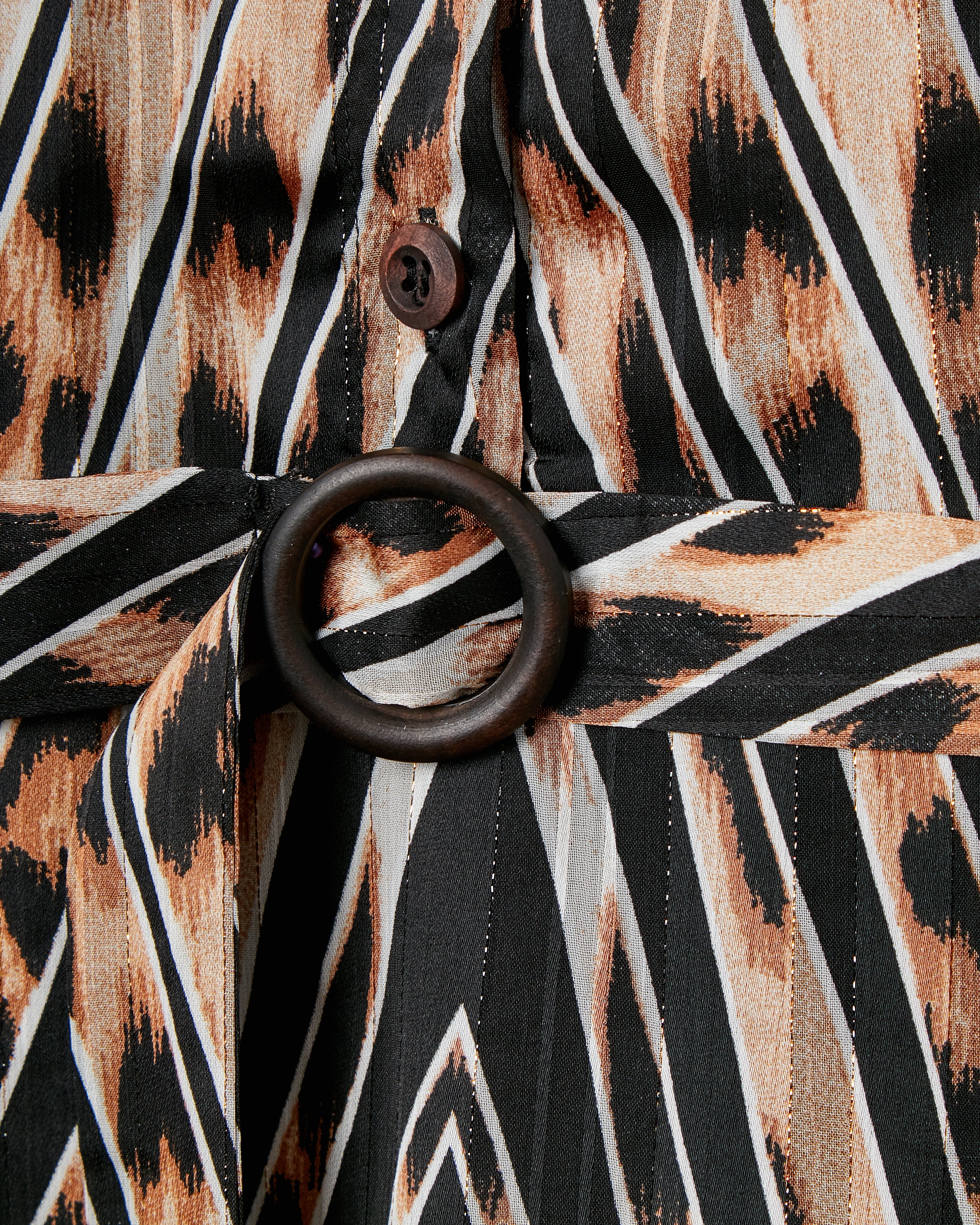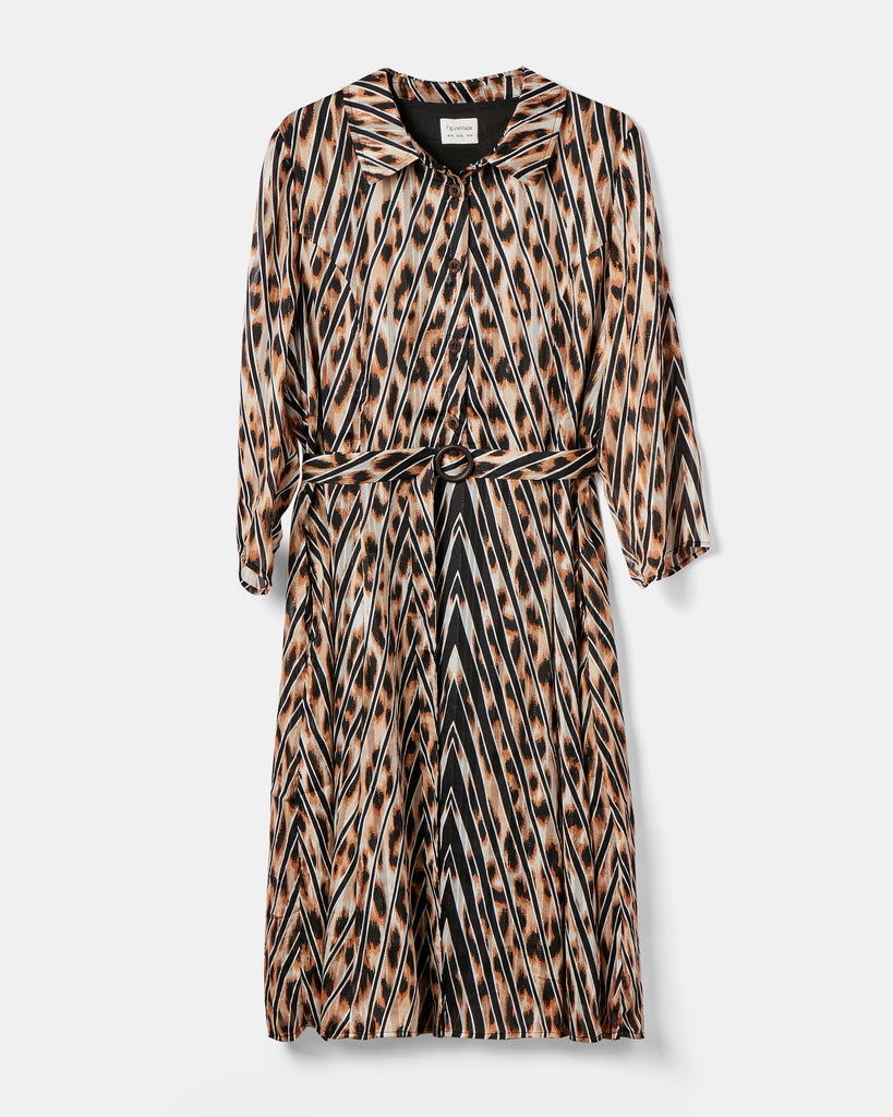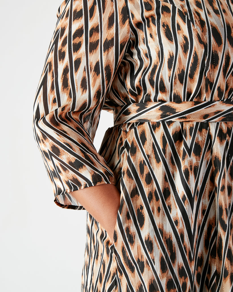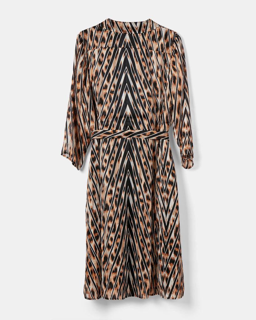 Add a touch of luxury and effortless glamour to your wardrobe with this timeless leopard print dress, featuring a distinctive chevron-striped pattern woven with shimmering copper thread. Designed to flatter, it includes princess seams that accentuate the waist and handcrafted wooden buttons thoughtfully placed to prevent gaping. A detachable belt with a custom wooden buckle offers styling versatility, while discreet side pockets add practical charm. Perfect for dressing up or down, this seasonless piece transitions beautifully through the year.